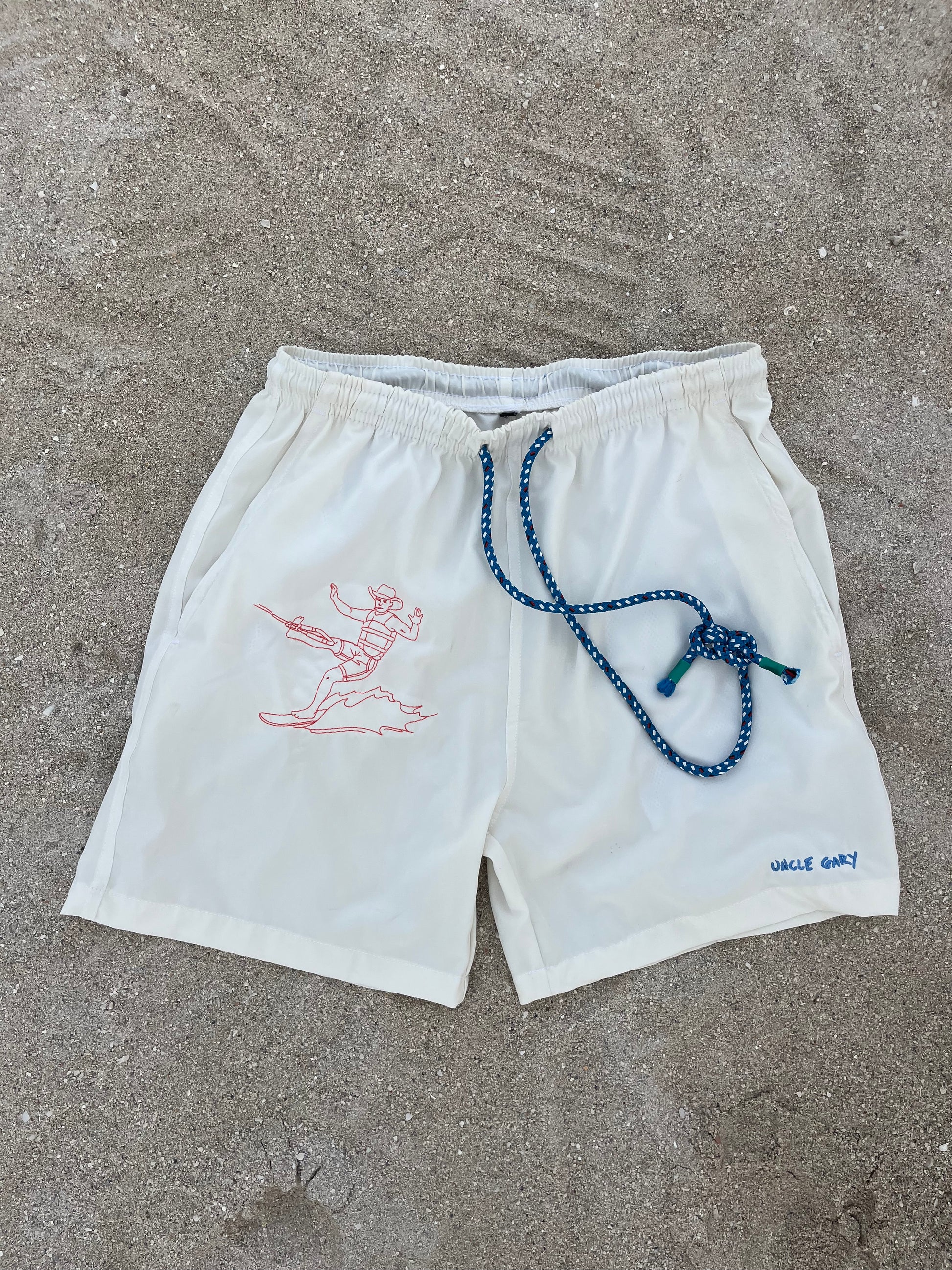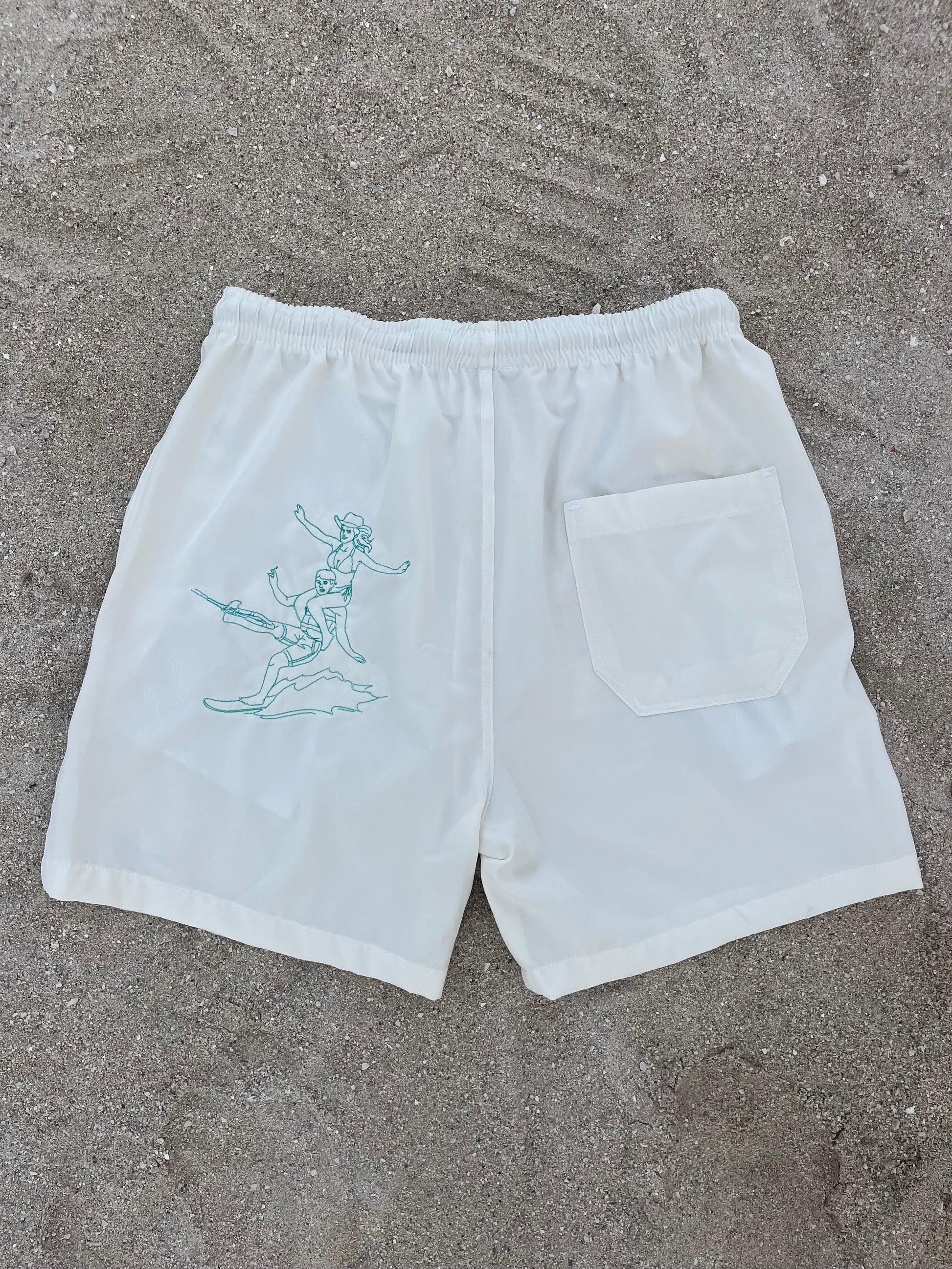 Embroidered. Boat rope draw-string. Non-lined. Undergarment recommended for aquatic activities. Sheer when wet. Pictured in medium. These sizes fit most. Order medium if you want them on the smaller side, order large if you want them on the larger size.